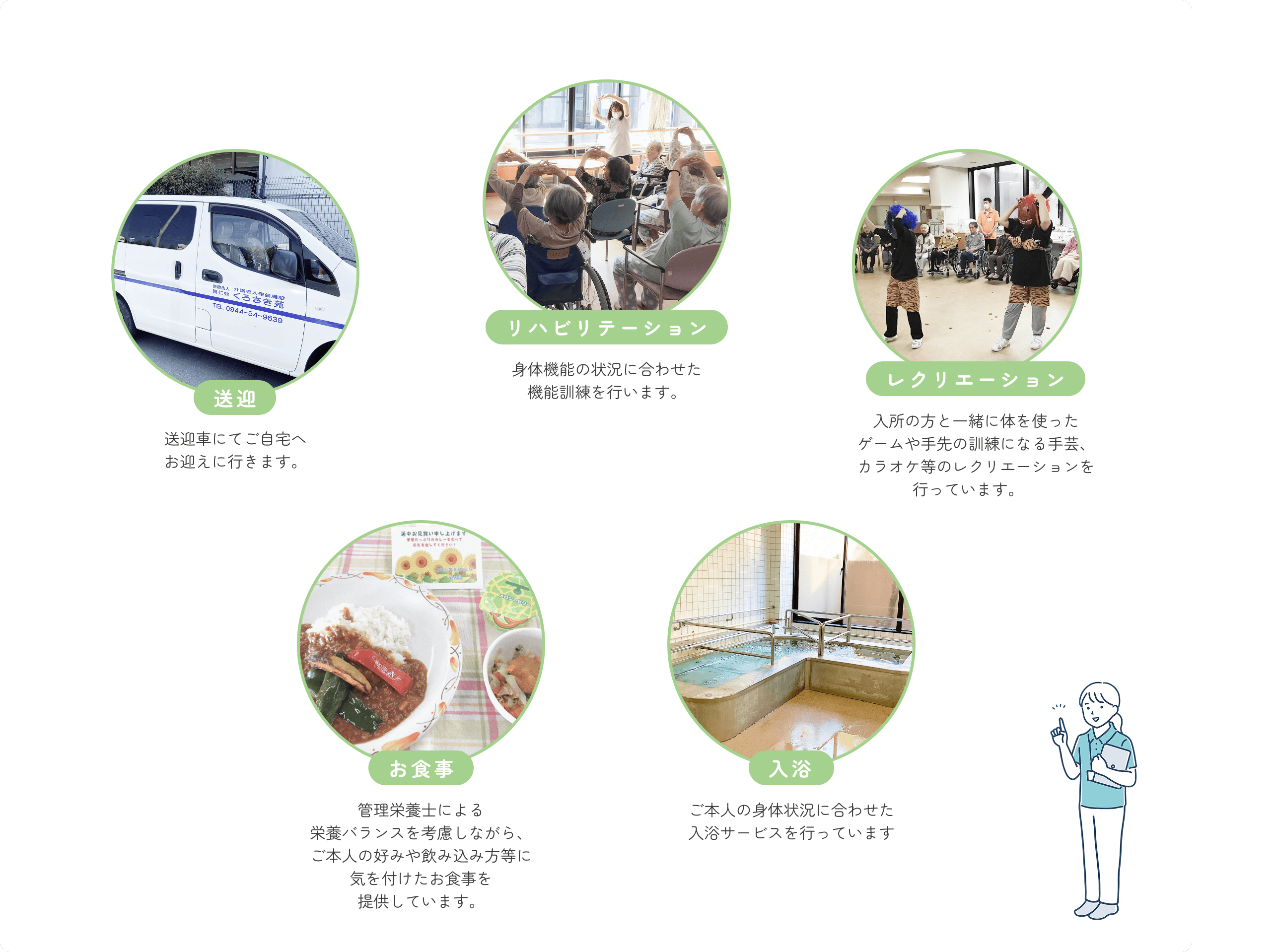 ショートステイ(短期入所)とは利用者が施設に期間を決めて短期的に入所し、日常生活のお世話や機能訓練などを受ける介護サービスです。利用者へのサービスであることはもちろんですが、ご家庭で介護を行っているご家族が体調を崩したとき、急用のために不在になるとき、毎日の介護の中で一息つきたいときに利用して頂くこともショートステイの事業目的です。送迎も専門スタッフが安心・安全を心掛けて対応いたします。在宅(家庭)では気付かない身体状況もショートステイの期間で医師・看護師・介護士等が接する中で早期発見が図れる場合があります。
